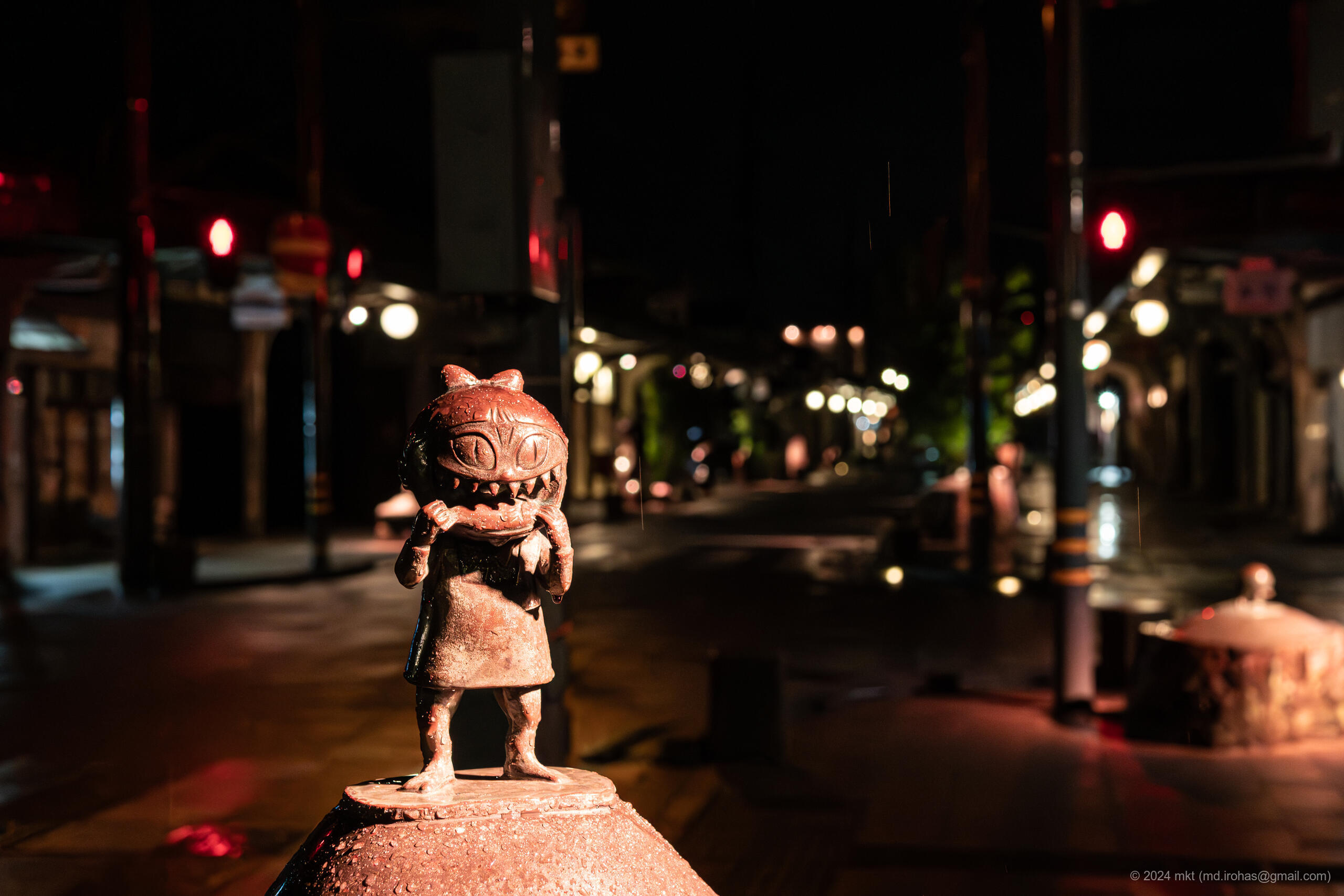 At night, the street transforms – the area is otherworldly lit up and the yokai statues take on a whole new mysterious presence in the darkness.